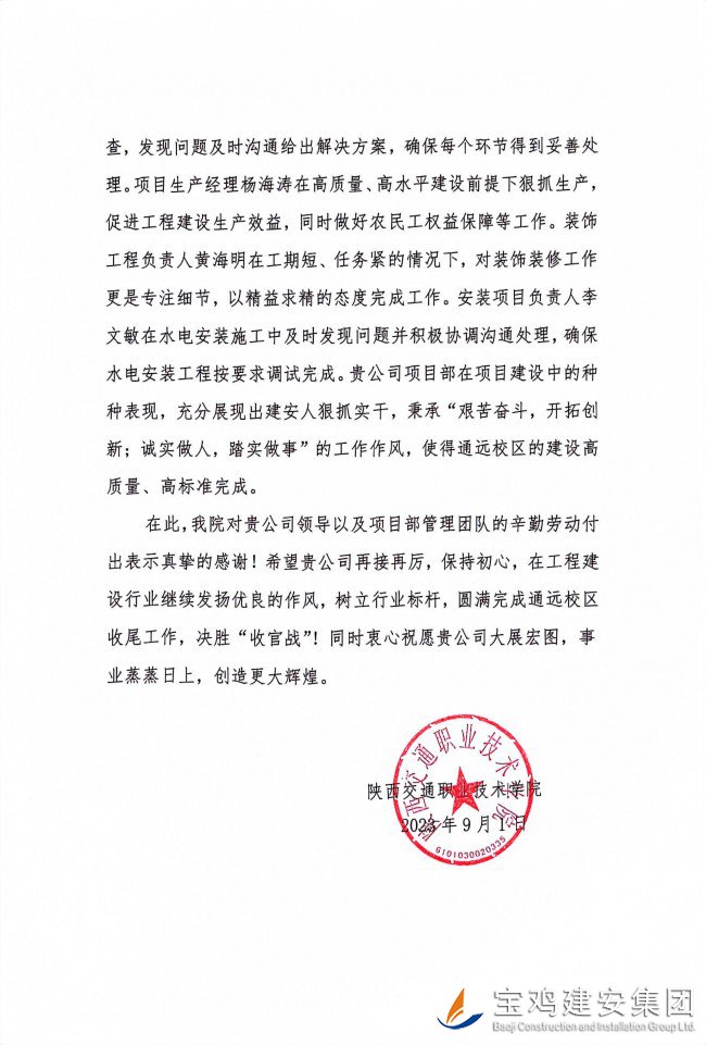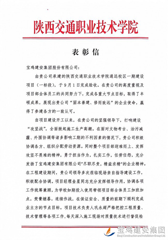 近日,由第十分公司承建的陜西交通職業(yè)技術(shù)學(xué)院新校區(qū)一期項(xiàng)目收到通報(bào)表彰信,對(duì)項(xiàng)目建設(shè)過程中相關(guān)管理人員及全體參建者表達(dá)真摯感謝和一致肯定,特別是對(duì)寶雞建安集團(tuán)在項(xiàng)目建設(shè)過程中所展現(xiàn)出來的“艱苦奮斗、開拓創(chuàng)新、誠實(shí)做人、踏實(shí)做事”的工作作風(fēng)給予了高度評(píng)價(jià)。